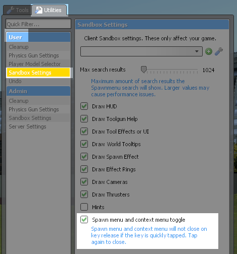 And an option for Spawn Menu and Context Menu keys to act as a toggle has been added to the Utilities panel: